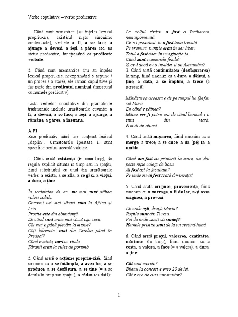 Exemple de verbe copulative eu sunt elev. A fi a exista a se afla a costa a proveni din a fi de loc din a se petrece a se întâmpla a se duce a trece a hoinări andrei este din arad. Ana a ajuns celebră. Ea va fi scris.