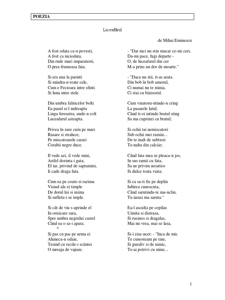 A fost odata ca niciodata o prea frumoasa fata. Privea în zare cum pe mari rasare si straluce. A fost odata ca niciodata o prea frumoasa fata. Un taram limitat ca si ele cu pajisti batatorite de la mersul lor agale in turma. în prima editie din 1939 perpessicius nu avea nimic dupa primul vers împotriva întregii traditii de pâna la el dar apoi revine la forma împodobita cu virgule pe care o stabilise de fapt c.