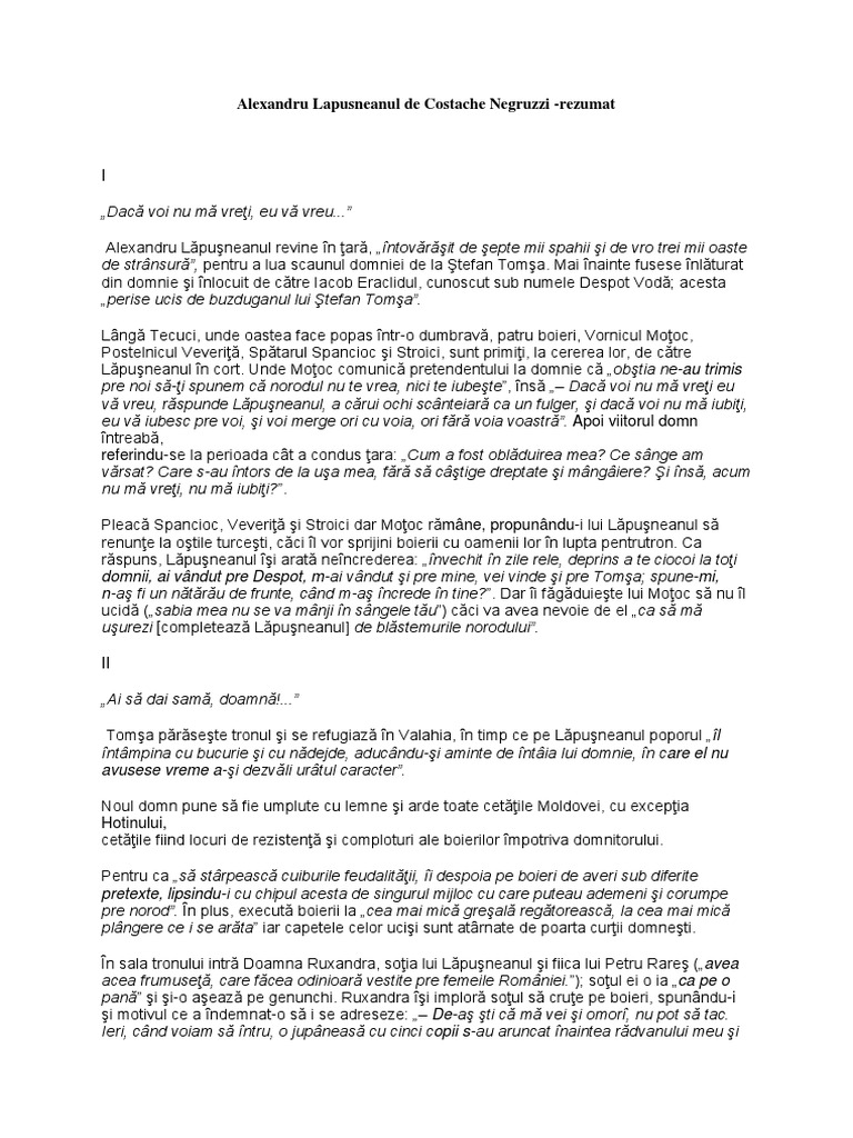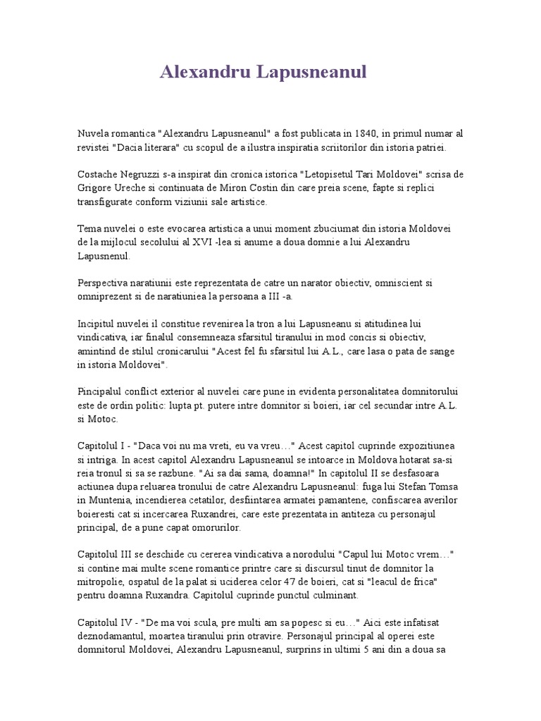 Costache negruzzi ramane in istoria literaturii romane drept intemeietorul nuvelei istorice. Alexandru lăpuşneanul de costache negruzzi rezumat si comentariu nuvela este inspirată din letopiseţul ţării moldovei de grigore ureche şi apare în anul 1841 în primul număr al revistei dacia literară. Tema nuvelei este de factura romantica este evocat destinul unui tiran sangeros alexandru lapusneanu intors la cea de a doua domnie. Lăpuşneanu însă le răspunde că el îi vrea şi asta este de ajuns.