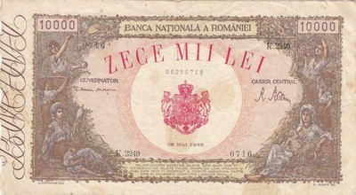 în dreapta vertical valoarea zece mii 10 000. Vertically right denomination zece mii 10 000. The romainian leu is divided into 100 bani. They are part of the old romanian lei banknotes series.