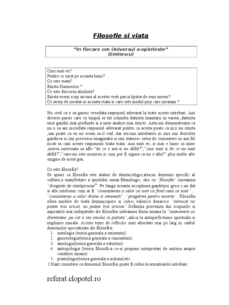 Ce este filosofia eseu. Filosofia si viata eseu. Filozofia este una din principalele forme ale manifestării spiritului uman. Prin om filosofia gândește umanul dincolo de el dar în jurul omului pivotează totul. Constantin noica afirmă că.