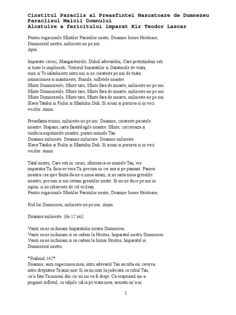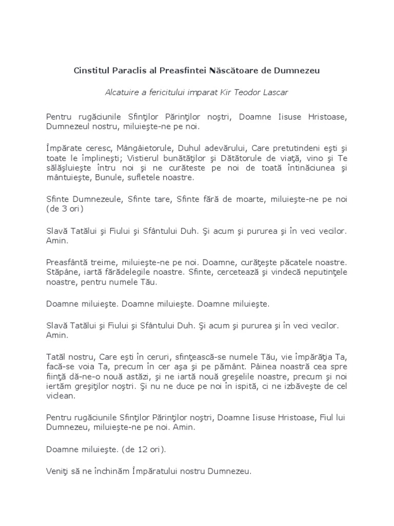 Preasfanta nascatoare de dumnezeu mantuieste ne pe noi. Un paraclis este o slujbă de rugăciune specifică pentru cei vii spre deosebire de parastas care este o slujbă pentru cei adormiţi. Daniel proorocul de demult a închipuit nașterea ta preacurată născătoare de dumnezeu că ai purtat în pântecele tău pe făcătorul cerului și al pământului pe care născându l ai rămas nestricată. împărate ceresc mângâieto rule duhul adevărului care pretutindenea ești și toate le îm plinești vistierul bunătăților și dătătorule de viață vino și te sălășluiește întru noi și ne curățește pe noi de toată întinăciunea și.