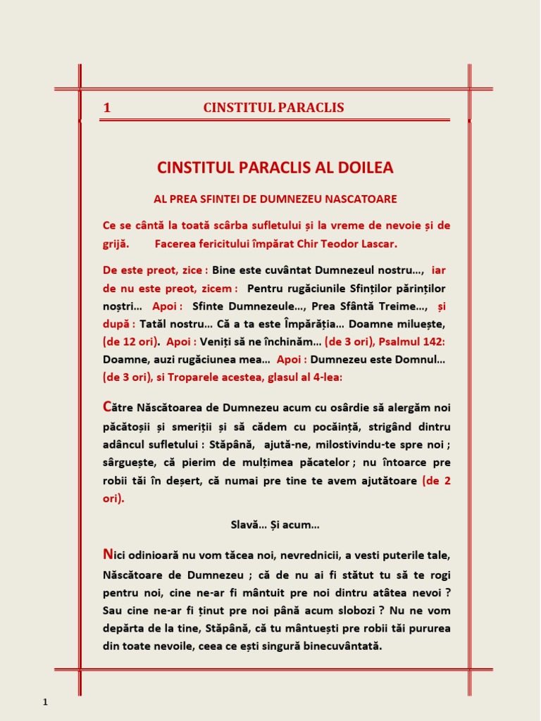 Stăpână milostiveş te te spre noi şi ne ajută. Către născătoarea de dumnezeu acum cu osârdie să alergăm noi păcătoşii şi smeriţii şi să cădem cu pocăinţă strigând dintru adâncul sufletului. Paraclisul preasfintei născătoare de dumnezeu acest paraclis se citeşte la întristarea sufletului şi la vreme de nevoie în numele tatălui şi al fiului şi al sfântului duh. Paraclisul preasfintei născătoare de dumnezeu.