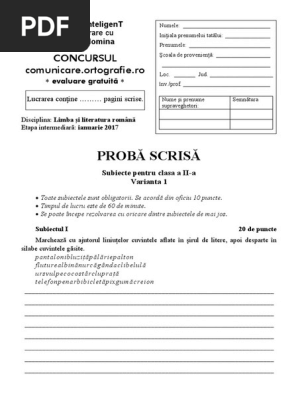 Review uri 0 0 stele adăugaţi un review. Prima pagină clasele 1 8 clasa a 2 a comunicare ortografie ro clasa a ii a 2019 2020. Concursul comunicare ortografie ro anul şcolar 2015 2016 subiecte pentru clasa a ii a subiectul i 5 puncte citeşte cu atenţie textul de mai jos şi răspunde cerinţelor formulate. A ii a comunicare ortografie ro 2012 subiecte si bareme cls.