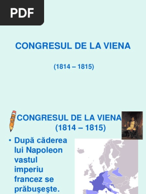 Congresul de la viena. Care sustinusera batalia împotriva frantei anglia rusia austria. Comemorăm anul acesta atât începutul cât și sfârșitul lungului secol xix perioada de relativă pace care începe cu congresul de la viena în septembrie 1814 și se sfârșește 100 de ani mai târziu în vara lui 1914 prin izbucnirea primului război mondial. Congresul de la viena 18 septembrie 1814 9 iunie 1815 a fost o conferință a statelor europene desfășurată la sfârșitul războaielor napoleoniene cu scopul de a reinstaura în europa ordinea conservatoare existentă înaintea izbucnirii revoluției franceze. Congresul de la viena germană wiener kongress a fost o conferință a ambasadorilor statelor europene prezidată de omul de strat austriac klemens von metternich care și a desfășurat lucrările în vienna în mod oficial din noiembrie 1814 până în 1815.