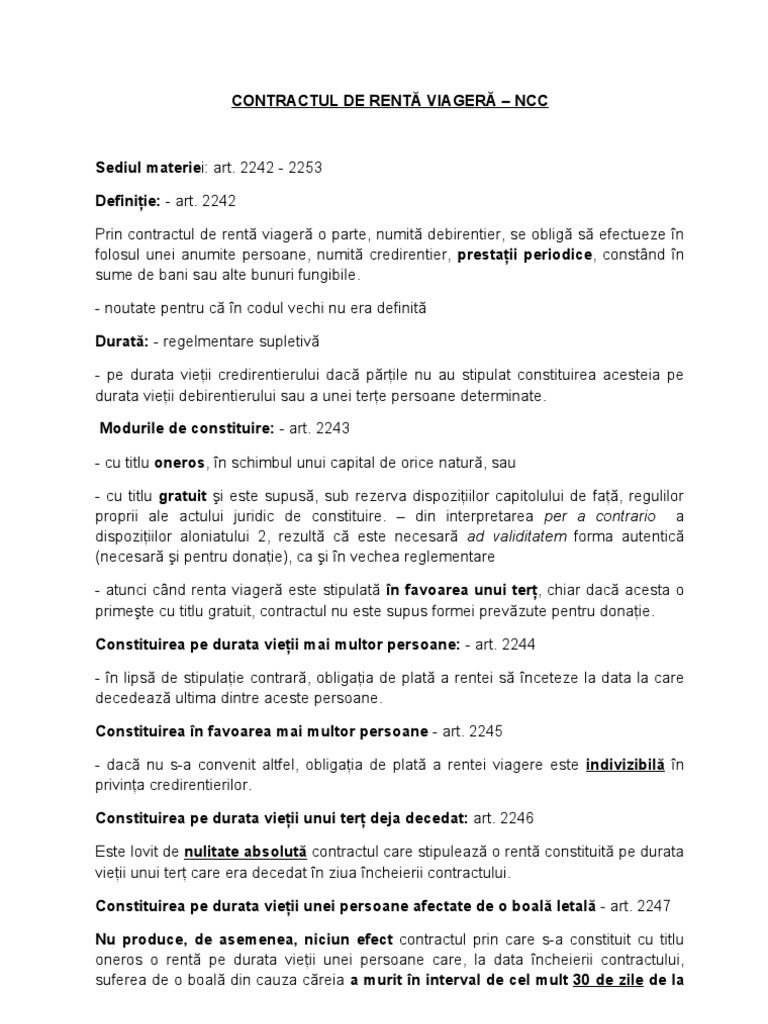 Renta viageră este reglementată de codul civil fiind un contract numit în capitolul xvii art. Renta viagera poate fi constituită cu titlu oneros atunci când se urmăreşte obţinerea în schimb a unui capital de orice natură sau cu titlu gratuit. Contractul de intretinere si de renta viagera. Contract de renta viagera rtf.