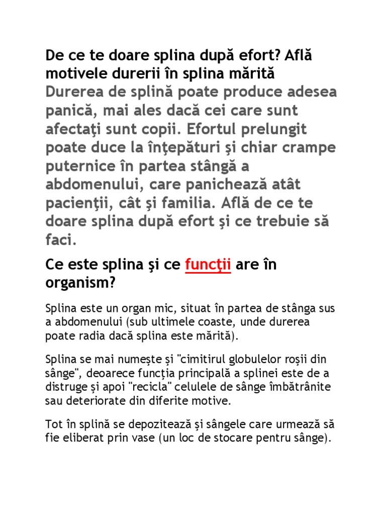 Cel mai bine este să consulți un medic hematolog sau internist care va efectua un set de analize complete și va stabili cauza exactă a durerii. Splina este cel mai mare organ al sistemului limfatic si are un rol important. Durere de splină după ce alergi. Durerile de splina pot avea mai multe cauze.