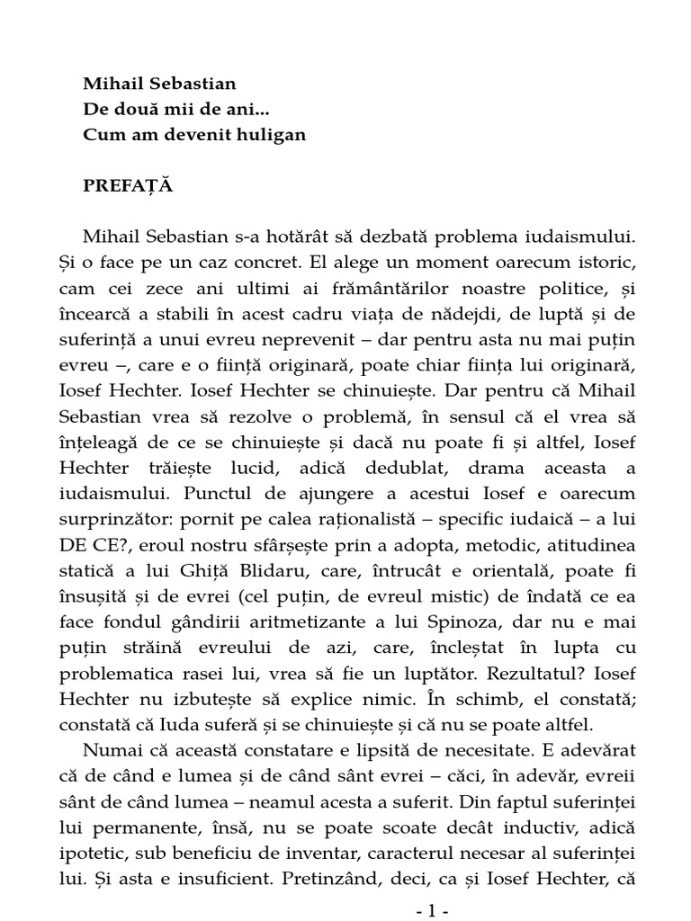 De doua mii de ani mihail sebastian pdf. şi o face pe un caz concret. De două mii de ani este confesiunea dureroasă a unui tânăr intelectual de origini evreiești ce încearcă să și găsească un loc în societatea românească interbelică dar și o oglindă a unei epoci tumultuoase ce prefigurează schimbările noii ordini de după cel de al doilea război mondial mihail sebastian pe numele său real iosif hechter scrie un roman aflat la. Este analizată pe larg prefața lui nae ionescu la romanul de două mii de ani de mihail sebastian. El alege un moment oarecum istoric cam cei zece ani ultimi ai frământărilor noastre politice şi încearcă a stabili în acest cadru viaţa de nădejdi de luptă şi de.