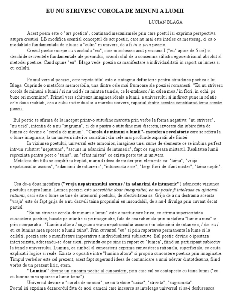 Eu nu strivesc corola de minuni a lumii deschide volumul de debut al autorului si anume poemele luminii aparut in 1919 si are ca simbol dominant lumina. Un mare constructor al modernismului romanesc din secolul al xx lea este eugen lovinescu. Arhiva cu 95 versuri de lucian blaga inclusiv. Eu nu strivesc corola de minuni a lumii şi nu ucid cu mintea tainele ce le ntâlnesc în calea mea în flori în ochi pe buze ori morminte.