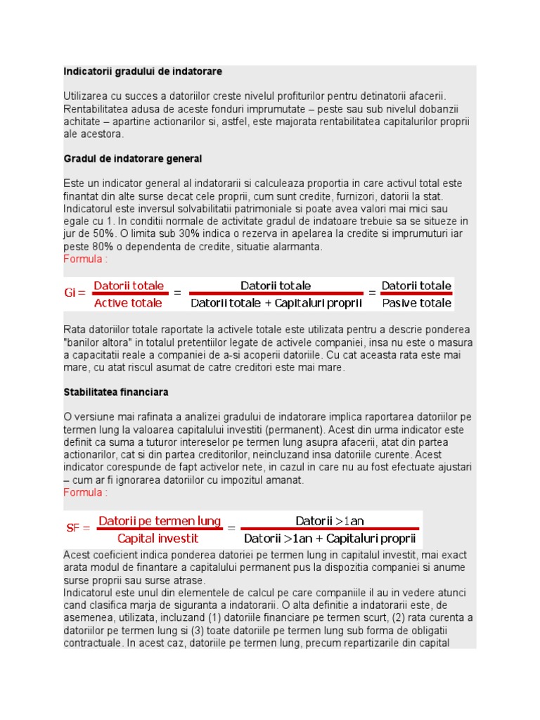 Gradul de indatorare interpretare. Venitului de 2 417 lei se va aplica gradul de indatorare de 62 iar rata la care se poate incadra clientul va fi de 1 498 lei un credit de 330 000 lei pe 30 ani. Gradul de îndatorare este un indicator general care se calculează ca o proporție între datoriile totale și activul total. Analiza financiara formula gradul de indatorare formule formule analiza financiara gradul de indatorare gradul de indatorare formula de calcul gradul de indatorare formula evidentiaza limita pana la care societatea isi finanteaza activitatea din alte surse decat cele proprii credite datorii la stat si furnizori. Cheltuielile cu dobanzile sunt integral deductibile in cazul in care gradul de indatorare a capitalului este mai mic sau egal cu trei.