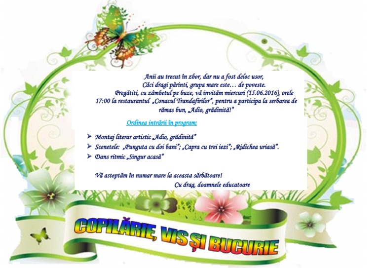 Este o invitatie pentru serbarea de 1 iunie. Prima pagină învăţământ primar alte discipline diverse invitaţie pentru serbare crăciun invitaţie pentru serbare crăciun 14 decembrie 2014 20 51. Cursuri şcoala online cursuri online primar cursuri online gimnaziu cursuri online liceu profesorul la clasă ghid practic de pedagogie resurse educaţionale interactive revista cadrelor didactice evenimente diplome pentru evenimente. Cu alta ocazie i as fi lasat pe ei sa scrie textul.