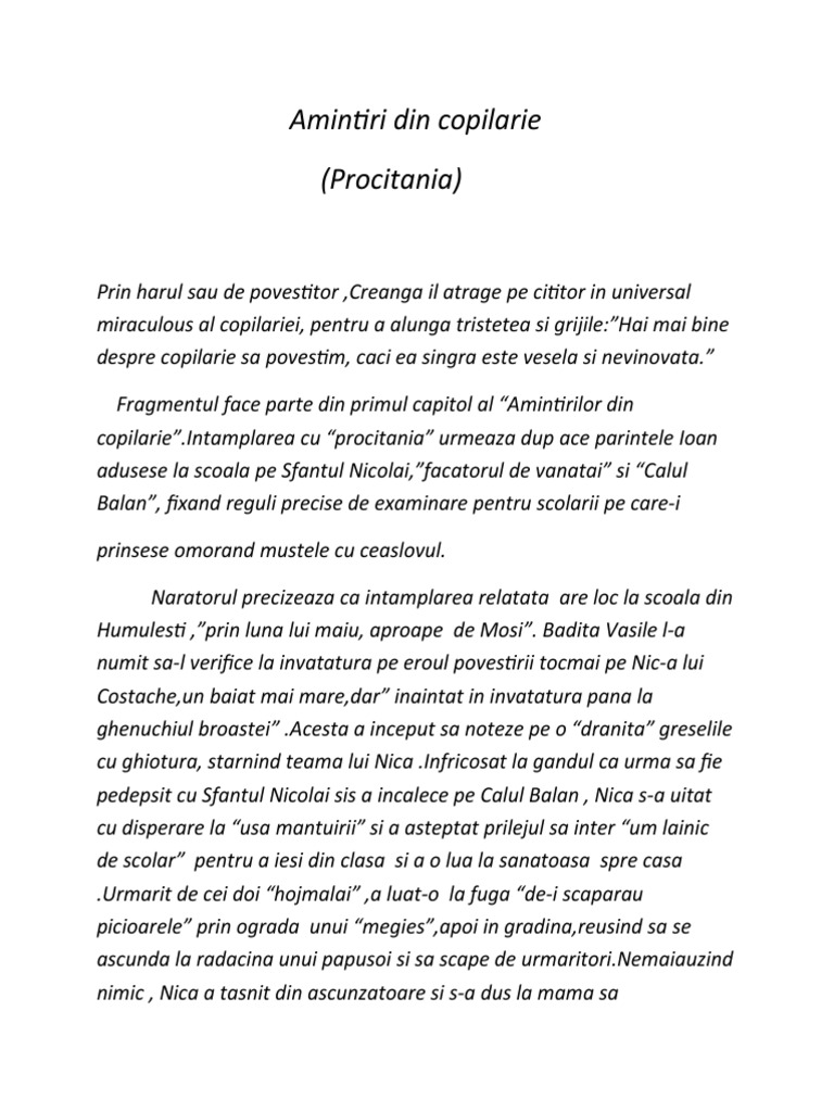 Ion creanga amintiri din copilarie rezumat. Amintiri din copilărie de ion creangă este o autobiografie alcătuită din patru părţi şi a cărei primă ediţie a fost publicată în 1880 1881 amintiri din copilărie explică acum la peste 100 de ani de la apariţie uimitoarea perenitate a operei lui ion creangă. Ion creangă n 1 martie sau 10 iunie 1837 humulești. Incã de la inceput naratorul fixseaza locul satul humulesti si timpul varsta fericita a copilariei. Copiii nu inteleg rostul scolii sunt indaratnici si de aceea parintele ioan om vrednic si cu bunatate le aduce ca dar de scoala noua pentru a i sili spre invatatura calul balan si pe sf.