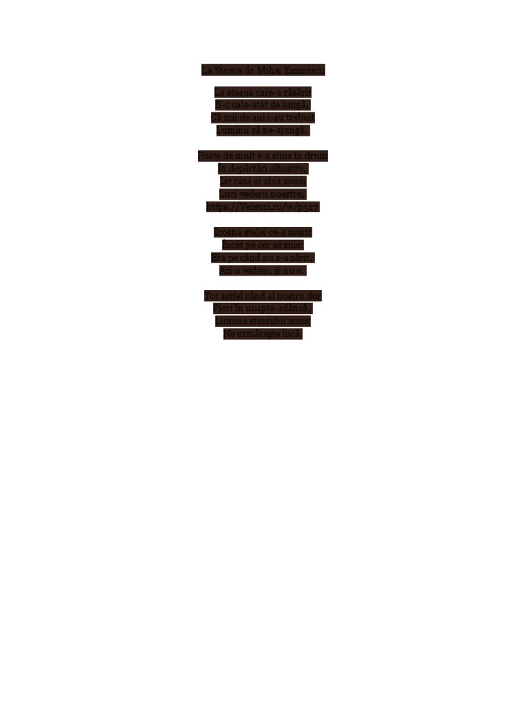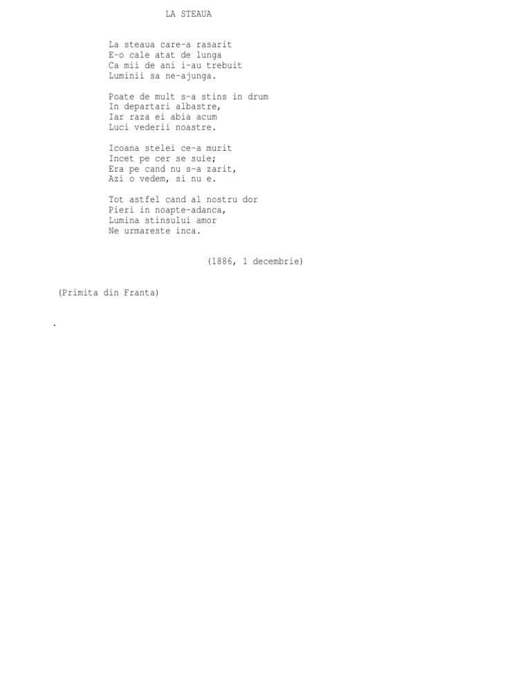 Poate de mult s a stins in drum in departari albastre iar raza ei abia acum luci vederii noastre. La steaua care a răsărit. Era pe când nu s a zărit azi o vedem şi nu e. Poate de mult s a stins în drum.