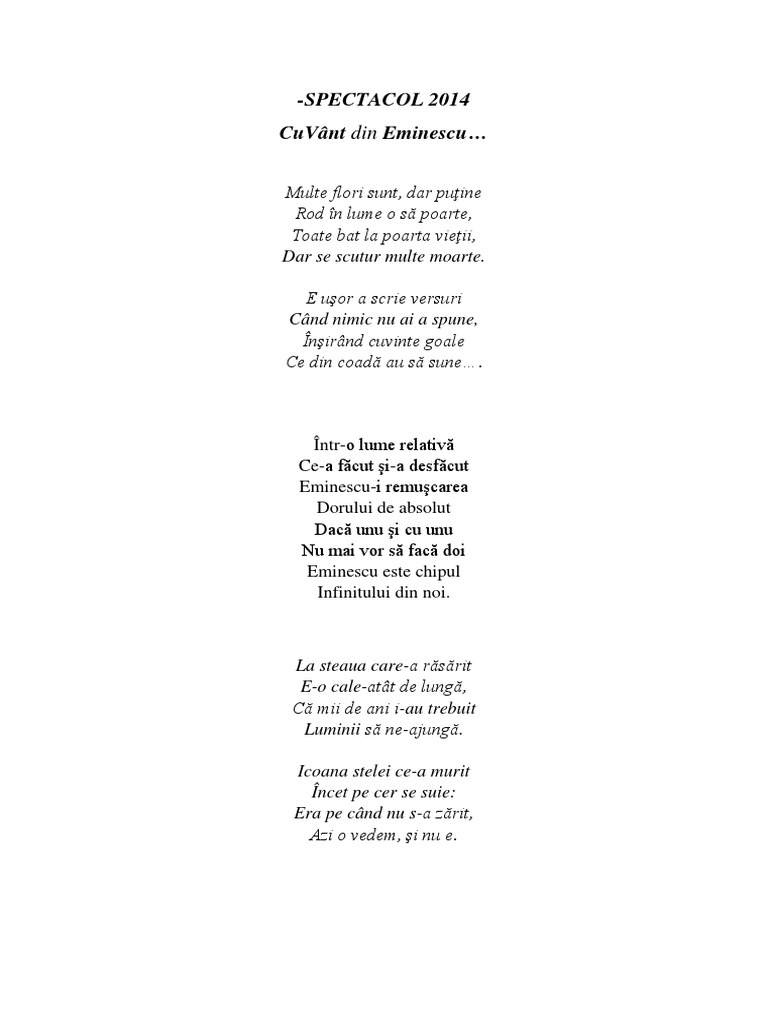 Varianta tehnoredactată în word a buchetului de versuri din creaţia eminescuană recitate sau cântate cu drag de generaţiile de elevi care au trecut pe la cercul fluieraşul. Cântecul românesc se însoțește cu vocile artiștilor de operetă gen muzical cu rădăcini adânci pentru care compozitorii români au scris pagini de neuitat. Poate de mult s a stins în drum în depãrtãri albastre iar raza ei abia acum luci vederii noastre. Icoana stelei ce a murit incet pe cer se suie.