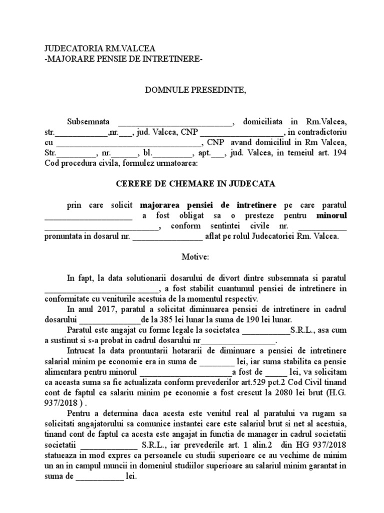 Majorare pensie de intretinere. Obligare pârât la cheltuieli de judecată de drept în întârziere domenii. în fapt prin hotărârea mai sus menționată pârâtul a a fost obligat ă să plătească lunar suma de. Actiune majorare pensie de intretinere aspecte teoretice prezentul model de actiune majorare pensie de intretinere se poate aplica situatiilor copiilor nascuti atat in timpul casatoriei cat si in afara acesteia. S e n t i n ţ a c i v i l ă nr.