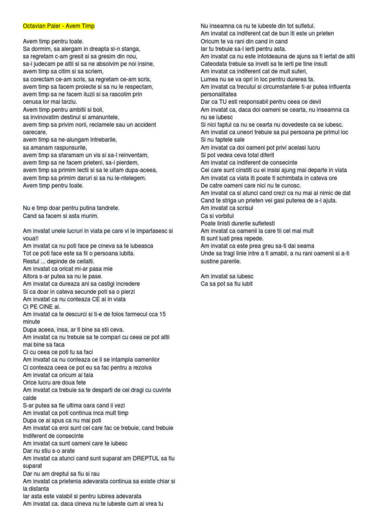 Avem timp pentru toate. Să dormim să alergăm în dreapta și în stânga să regretăm ce am greșit și să greșim din nou să i judecăm pe alții și să ne absolvim pe noi înșine. Să dormim să alergăm în dreapta şi n stânga să regretăm c am greşit şi să greşim din nou sa i judecam pe alţii şi să ne. Avem timp versuri octavian paler avem timp pentru toate.