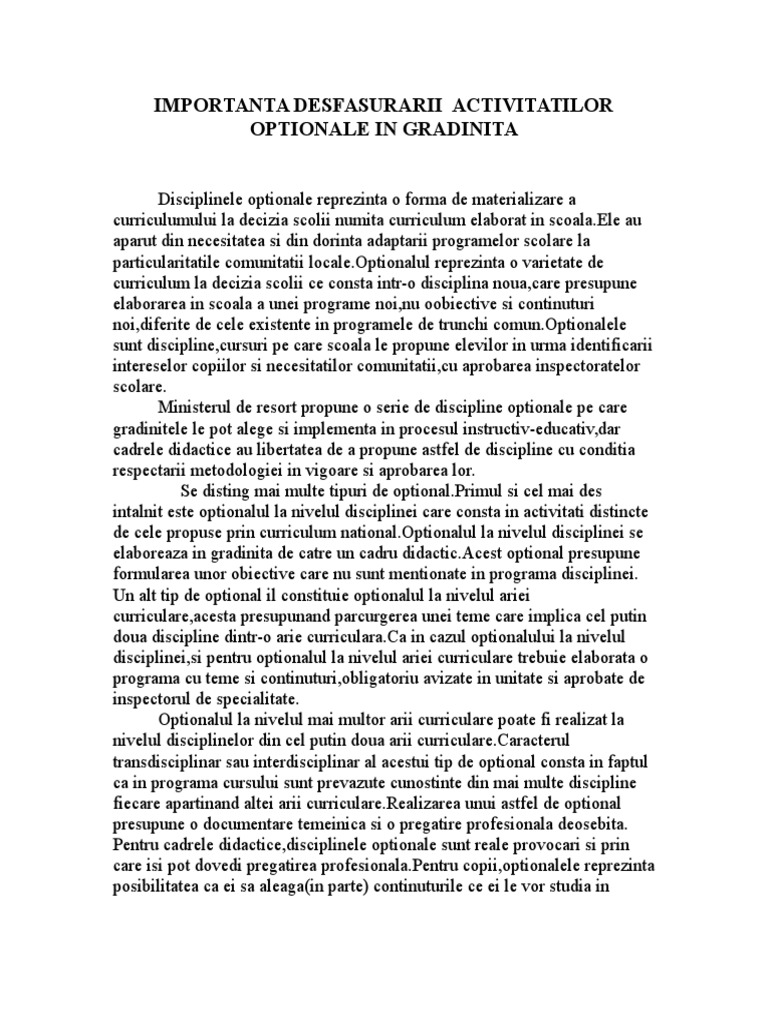 Optionale gradinita avizate de minister. Punct unic de contact electronic. Materiale pentru activitati optionale. Procedura avizare optionale 2019 2020 pdf 738 07 kb autor. întrebată de ce a fost nevoie de schimbarea curriculumului de grădiniță inspectoarea generală a declarat pentru edupedu ro că în curriculumul din 2008 nu aveam și componenta 0 3 ani curriculumul pentru creșă n red și noi vorbim încă din 2011 de educație timpurie care înseamnă și nivelul antepreșcolar și.