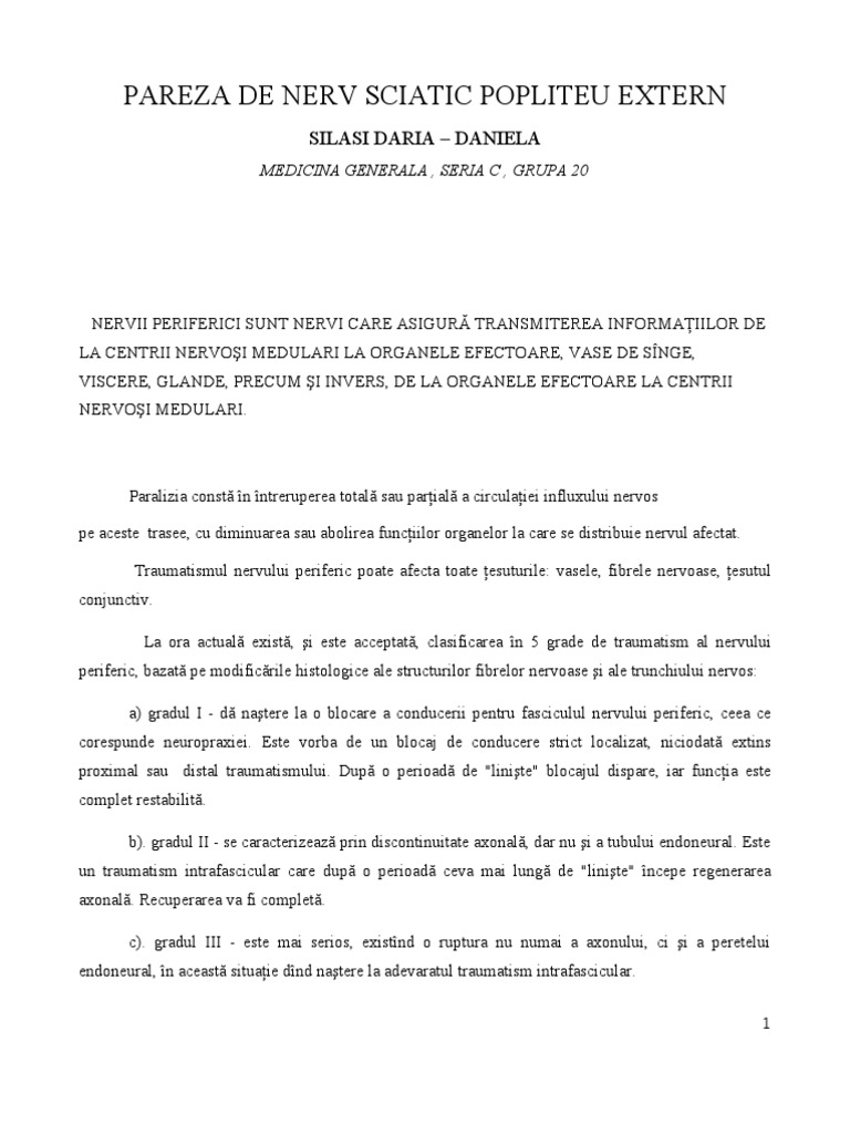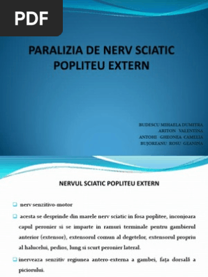 Nervul sciatic asigura inervatia flexorilor genunchiului si a tuturor muschilor situati inferior de genunchi ceea ce inseamna ca dintr o paralizie completa de nerv sciatic rezulta un picior nefunctional si dificultati severe in ceea ce priveste mersul. Extensia dorsală a degetelor şi piciorului cu menţinerea boltei plantare este asigurată de către sciaticul popliteu extern. Silasi daria daniela medicina generala seria c grupa 20. Forum medical de un an am ramas cu o pareza de sciatic popliteu extern am facut recuperare tratament cu cerebrolysin dar rezultatele sunt minime vreau sa stiu daca exista vreun tratament chirurgical de refacere a nervului lezat multumesc.