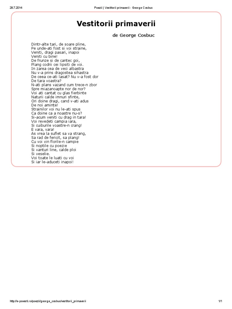 Poezii scurte de george cosbuc. Ieri era frumos pe afara ca ntr o calda zi de vara. George cobuc devine în scurtă vreme unul din animatorii poeș tici ai societăţii virtus romana rediviva al cărei președinte va deveni în 1883. în paginile revistei școlare musa someșană are loc debutul absolut al poetului cu poezii care prefigurează o serie. Valuri de aur mărgăritare purpură roze şi diamant din carul zilei de amarant revarsă febus fără ncetare.