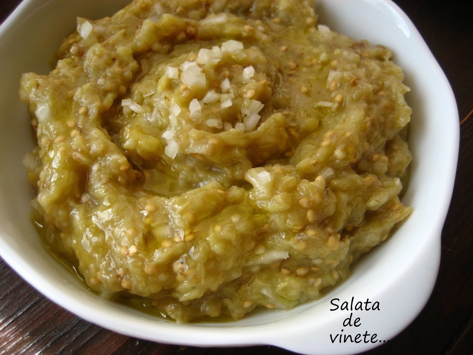 1 ceapa 1 vanata mare 3 catei de usturoi 3 linguri pasta de rosii 3 linguri ulei masline 3. 1 ceapă mică foarte fin tocată. This eggplant dip is a traditional romanian eggplant dip or spread known as salata de vinete served with bread made with only 4 ingredients. Mancam cu pofta cat mancam iar restul salatei il mut in caserola de plastic cu capac si l dau la rece.