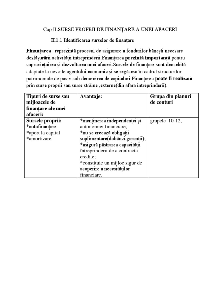 Identificarea tipurilor de surse de finantare. Capitalurile proprii reprezintă sursele proprii de finanţare ale agenţilor economici formate prin aporturile acţionarilor sau asociaţilor dar şi prin autofinanţare respectiv din alte surse proprii cum ar fi profitul obţinut. 3 surse proprii de finantare. Finatarea prezinta importanta deosebita pentru supravietuirea si dezvoltarea unei afaceri.
