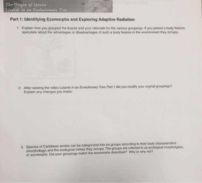 Identifying ecomorphs and exploring adaptive radiation 1. Lizards in an evolutionary tree 1. The origin of species lizards in an evolutionary tree part 1. Lizards in an evolutionary tree.