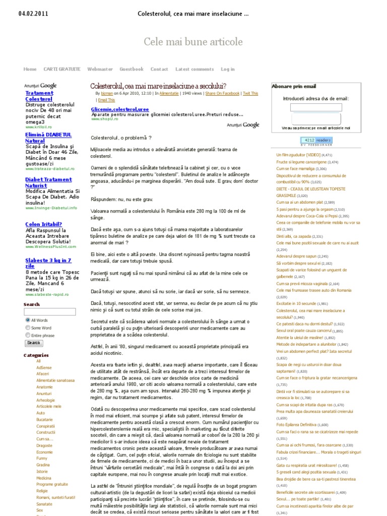 In mod normal nivelul de colesterol in limite normale nu variaza foarte mult in randul adultilor. Consumul de colesterol trebuie limitat la sub 300 mg zi. Laboratorul dă valorile normale în funcţie de ce valori normale se introduc cu ajutorul tastaturii nu în funcţie de valorile medii a unui grup de 85 90 sau 95 dintr un eşantion considerat sănătos aşa cum ar trebui potrivit unei definiţii ştiinţifice a normalului. Odată cu descoperirea unor medicamente mai specifice care scad colesterolul în mod mai eficient mai scumpe şi aflate sub patent interesul firmelor de medicamente pentru această clasă a crescut enorm.