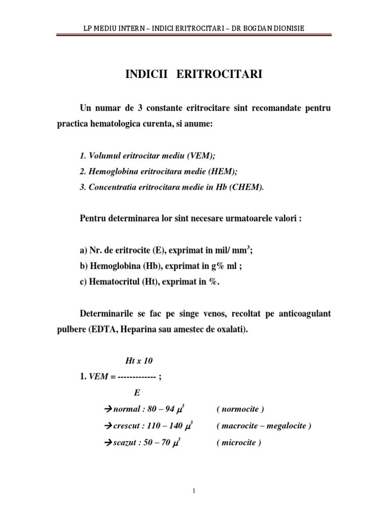 Volum eritrocitar mediu scazut. Vem este masurat in femtolitri fl sau micrometri cubici. Medie de hemoglobina. Volumul eritrocitar mediu vem ne dă informaţii asupra mărimii hematiei este scăzut în anemiile feriprive şi talasemii normal în anemii posthemoragice crescut în anemia pernicioasă. Acest parametru depinde de osmolaritatea plasmatica si de numarul diviziunilor eritrocitare.